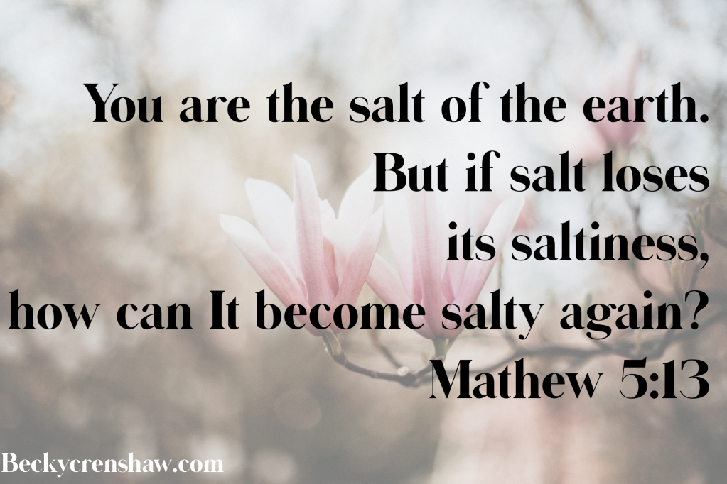 You are the salt of the earth. But what good is salt if it has lost its flavor? Can you make it salty again? It will be thrown out and trampled underfoot as worthless. Matthew 5:13