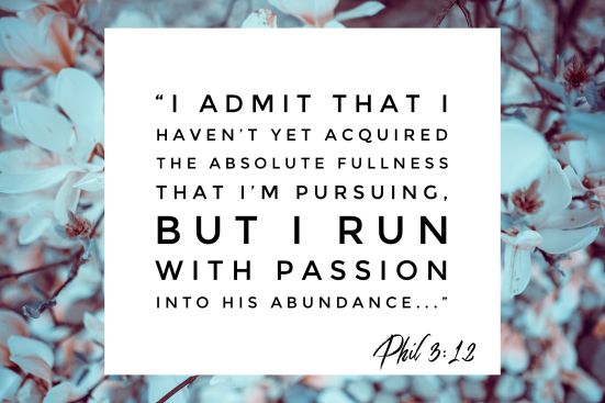 I admit that I haven’t yet acquired the absolute fullness that I’m pursuing, but I run with passion so that I may reach the purpose that Jesus Christ has called me to fulfill and wants me to discover. 13 I don’t depend on my own strength to accomplish this; however I do have one compelling focus: I forget all of the past as I fasten my heart to the future instead. 14 I run straight for the divine invitation of reaching the heavenly goal and gaining the victory-prize through the anointing of Jesus. 15 So let all who are fully mature have this same passion, and if anyone is not yet gripped by these desires, God will reveal it to them. 16 And let us all advance together to reach this victory-prize, following one path with one passion.