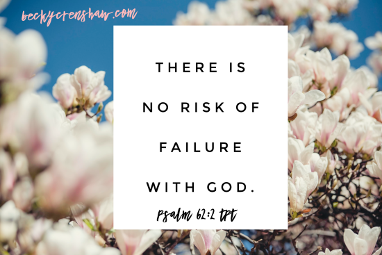 Think about all the areas you are experiencing “failure” feelings. With God there is NO risk of failure. So those feelings are just that – feelings. He is your victory! We aren’t being graded on motherhood, marriage, friendship, etc. with Him.