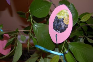 Glue pictures on card stock or construction paper, attach short pieces of string, and hang the pictures on the branches.