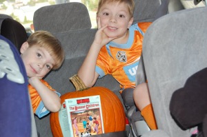 I turn around to find a large pumpkin, strapped in a seat belt. Seated between the boys. Reading a book.Yes, I just said that.The argument? What chapter the pumpkin is reading.