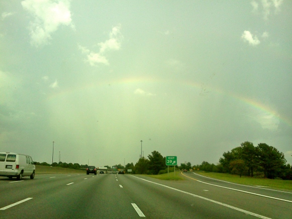A camera can do no justice to the brilliance of this enormous rainbow. God’s stunning colors arched over the entire interstate. Our welcome.
