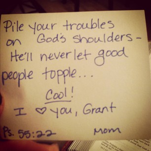 Yesterday, I shared about Miss Joy. I am enjoying her old Bible… my new/used/cute/Goodwill Bible. Hence The Message paraphrase of this familiar verse…Cast your Cares on the Lord and He will sustain you. I thought my visual-learning boys would be able to picture piling worries on God’s shoulders. Love.