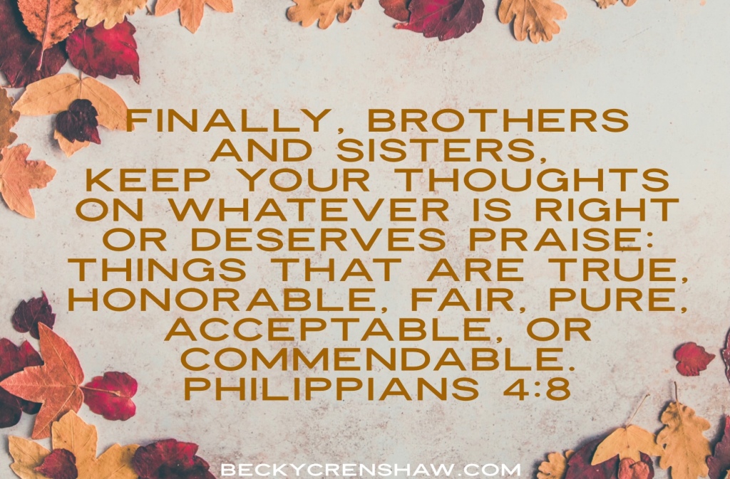 Finally, brothers and sisters, keep your thoughts on whatever is right or deserves praise: things that are true, honorable, fair, pure, acceptable, or commendable. Philippians 4:8 GNT
