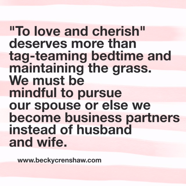 Confession:Brent and I are amazing roomies. Seriously — The best co-habitators on the planet. Which is great for operating a home, but horrible for intimacy. And mere co-habitation is what raising kids will do to marriage if we all aren’t careful! “To love and cherish” deserves more that tag-teaming bedtime and maintaining the grass. We MUST be mindful to pursue our spouse or else we become business partners instead of husband and wife.