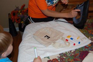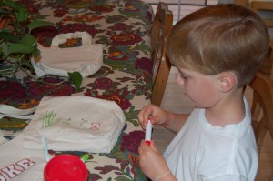 Take along bags: Arp encouraged her children to make a bag for themselves each summer. Their own take along bag. Each child was responsible to put whatever they wanted in it to bring along for the ride. I let the boys pick out canvas bags at Hobby Lobby and they chose their own iron on letter. Once, the letter was applied, they used fabric markers to draw their own creations. They were so into this.