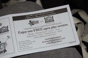 Now onto –Destination Wacky Fun Day! Our original plan was to go to the zoo, as requested on our brainstorm list, but it was a yucky, rainy morning. So, we decided to pull out our Summer Reading Coupon book from last summer to see if there were any options for us. We decided on Bounce House (inflatables), an indoor picnic and the Library!