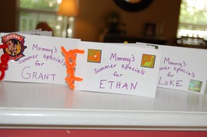 Just Me and Mom Time – UpdateSanity in the Summertime suggested making a coupon book for your child to cash in on Just Me and Mom Dates. So, going by the book as promised, I made a “Mommy’s Summer Specials” book for each child.