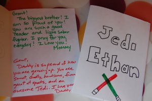 So yesterday morning, each boy came to the breakfast table to find a little “Jedi” note at their plate. Grant got a little emotional and teary, sweet little thing. It wasn’t my words that touched him so much – it was his daddy’s! A father’s encouragement in a child’s life runs so deep. Ethan was so funny. He looked at it, smiled, then put it down. I asked him, “Did you read it?” He said, “I wed the gween words, but I couldn’t weed the wed.” Grant chimed in, “Yea Dad. You should practice D’Neilian.” Hilarious.
