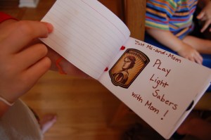 I had not told the boys anything about Mommy Dates, so they were very surprised and excited. (All but Luke, who didn’t understand any of it and just threw his book on the floor) BUT! I wrote his book really more for myself – to hold myself accountable. I know he is little (22 months) , but he still needs and deserves designated time with me – on his turf, doing what he loves. Here are examples….