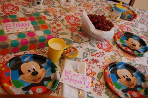 The day started out with my Mommy date with Grant (my oldest). He had asked to go look at books at the bookstore. So while we were driving, I explained to him that he and we were going to be planning a “Your Special” party for Ethan and that I needed his help! He was all over that. So I let Grant pick out some party plates (I gently guided him to the ones on sale :)) and a happy present for Ethan. Of course this couldn’t be an expensive ordeal so we simply bought his favorite cereal – Fruit Loops with Marshmallows (a special treat), and bought ingredients for a special meal. It was really sweet to see Grant get so excited about honoring Ethan.